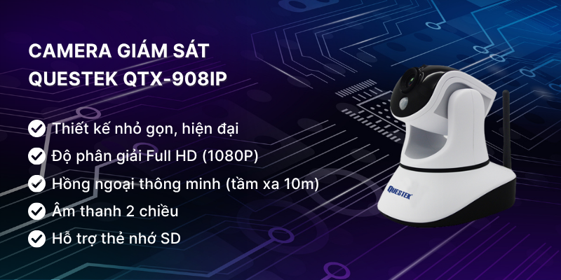 - Questek QTX-908IP: Thiết kế nhỏ gọn, đèn hồng ngoại quan sát ban đêm rõ nét (tầm nhìn xa 10m), hỗ trợ cổng âm thanh 2 chiều đàm thoại trực tiếp và khe cắm thẻ nhớ SD 32GB, dễ dàng sử dụng cho mọi gia đình, cửa hàng, văn phòng.