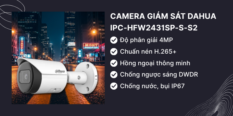 Tại sao được ưa chuộng? Đây là một trong những mẫu camera IP bán chạy nhất của Dahua nhờ sự kết hợp hoàn hảo giữa độ phân giải cao, khả năng nén hiệu quả và độ bền vượt trội. Với độ phân giải 4MP, IPC-HFW2431SP-S-S2 cung cấp hình ảnh sắc nét, chi tiết. Chuẩn nén H.265+ giúp tiết kiệm đáng kể băng thông và dung lượng lưu trữ, là lựa chọn lý tưởng cho cả gia đình và doanh nghiệp nhỏ.