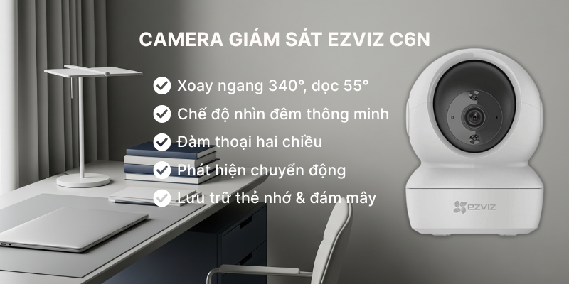 Ezviz C6N là cái tên không thể bỏ qua khi nhắc đến camera giám sát để bàn. Với thiết kế nhỏ gọn, khả năng xoay 360 độ linh hoạt cùng độ phân giải Full HD 1080p, C6N mang lại hình ảnh sắc nét và bao quát toàn bộ không gian.