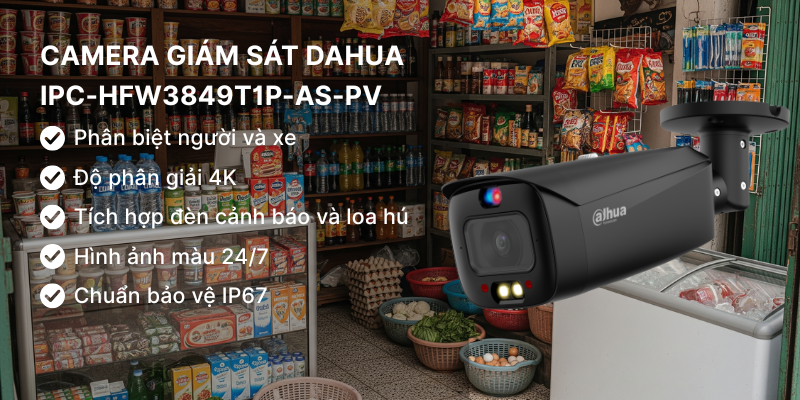 • Dahua IPC-HFW3849T1P-AS-PV (Full-color Active Deterrence): Camera Bullet 8MP (4K), hình ảnh màu 24/7, tích hợp đèn cảnh báo và loa hú (chủ động xua đuổi), rất hiệu quả cho cửa ra vào.