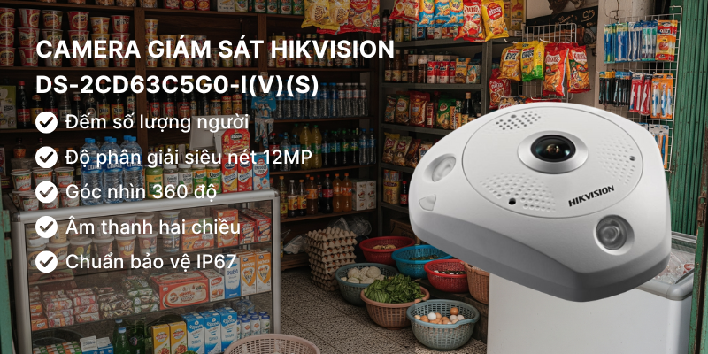 • Hikvision DS-2CD63C5G0-I(V)(S) (Fisheye): Camera mắt cá 12MP, góc nhìn 360 độ, nhiều chế độ hiển thị (panoramic, 4-view), tích hợp mic.