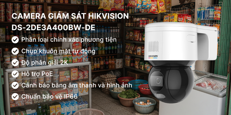 • Hikvision DS-2DE3A400BW-DE (F1)S5 (PTZ): Camera PTZ 4MP, hồng ngoại và ánh sáng trắng (ColorVu) cho hình ảnh màu 24/7, mic & loa tích hợp, phù hợp giám sát khu vực quầy thu ngân và lối đi lớn.